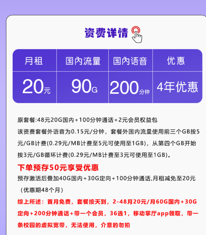移动飞博卡【20元90G+200分钟+会员】