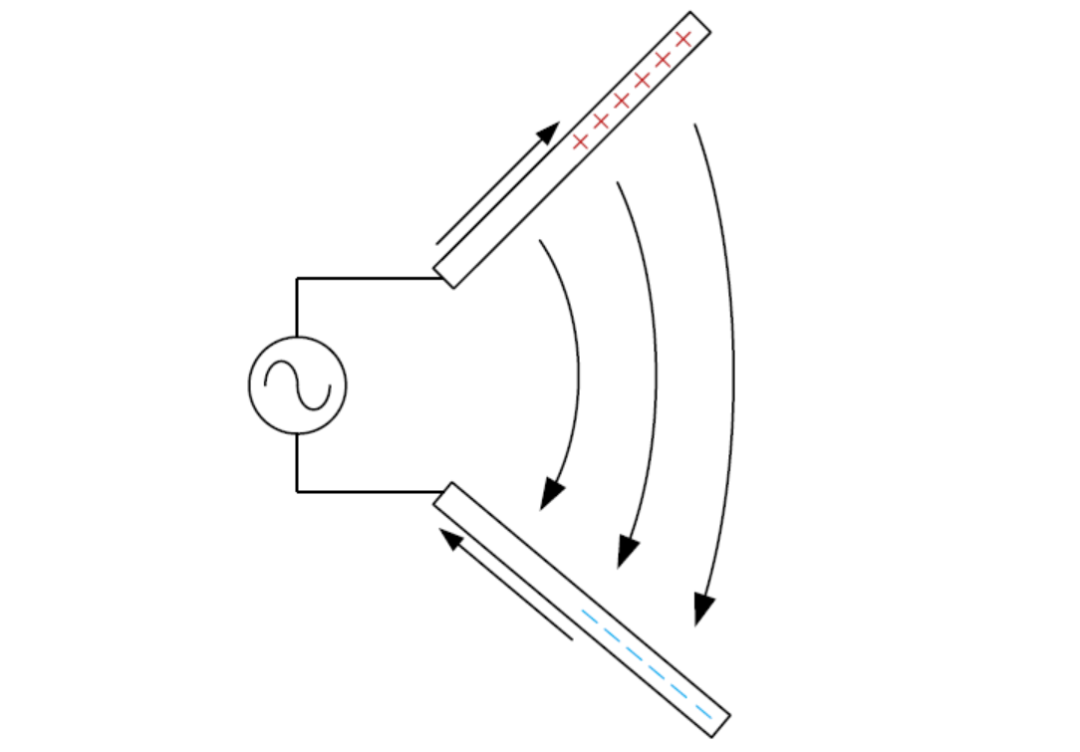 当平行双导线的夹角开始张开,如下图所示,双导线上开始出现部分相同方向的电流,所产生的感应电动势也有部分开始增强,因此电磁场的辐射能力开始增强。