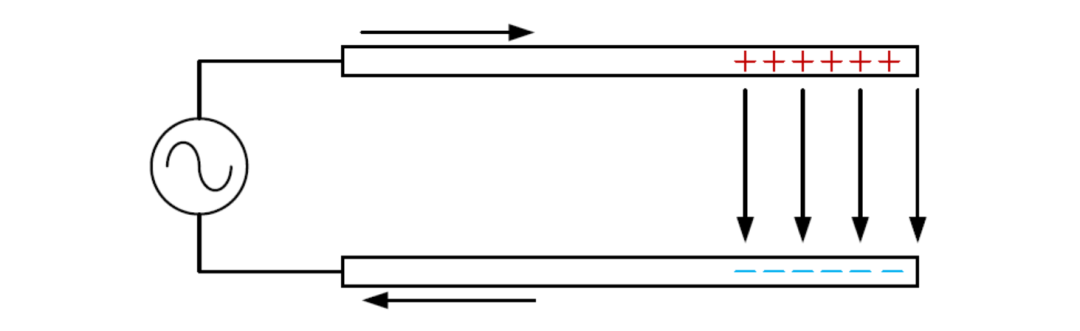 当平行双导线距离比较近时,如下图所示,导线上的电流流向相反,所产生的感应电动势几乎可以互相抵消,电磁场被束缚在平行双导线附近,难以向空间中传播。